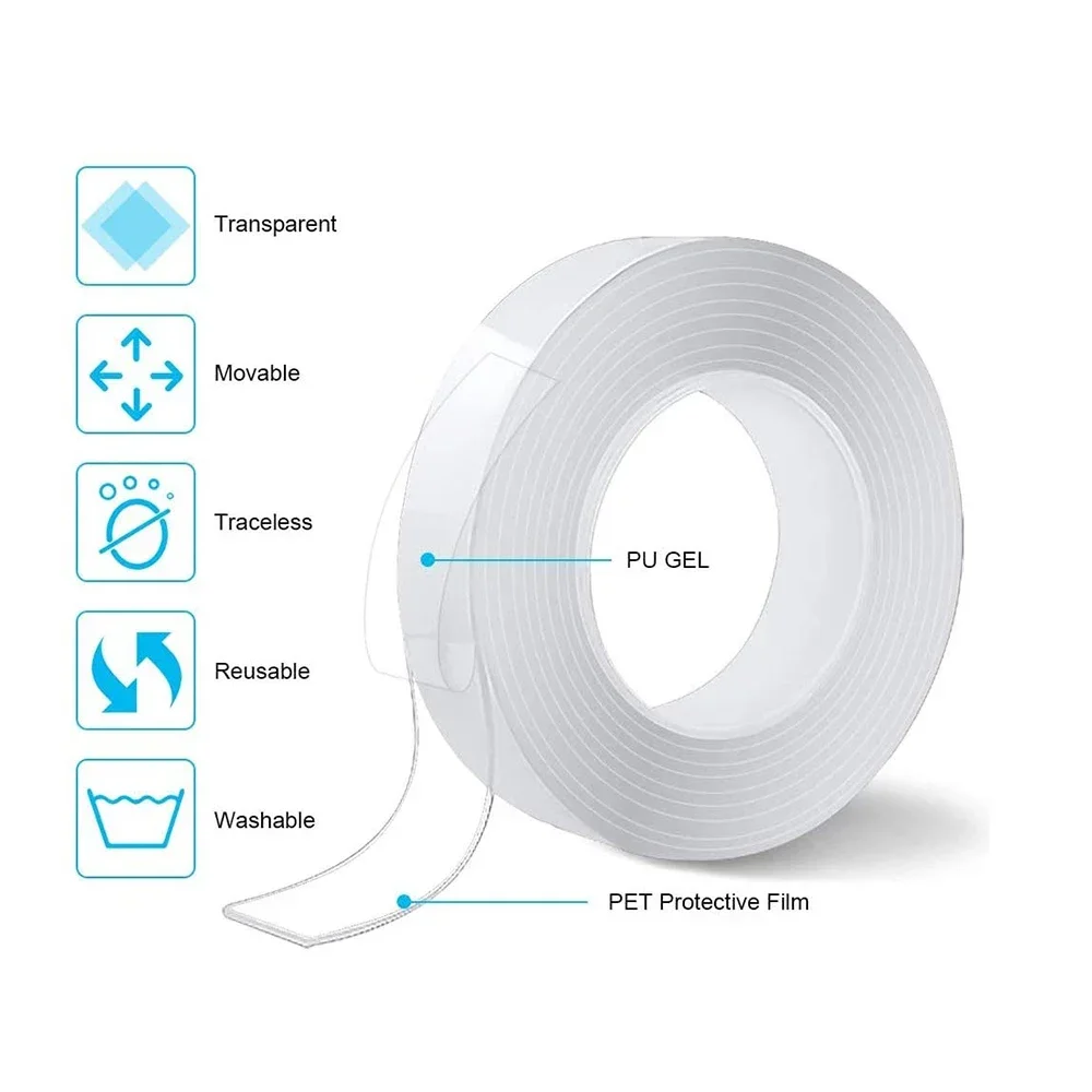 Specifications:Material: High-quality Nano-tech AdhesiveSize Options: Available in 5m, 3m, 2m, and 1m lengthsAdhesive Type: Double-sided, with a strong hold on various surfacesDesign: Transparent, allowing for aesthetic versatilityFunctionality: Waterproof, heat resistant, and reusableApplicable Scenarios: Ideal for home, office, and DIY projectsFeatures: | 3m 30 Lb Double Sided Tape | Removable Double Sided Tape For Paper | Double Sided Tape 3m | **Versatile and Durable Adhesive**The Transparent Double Sided Nano Tape is a versatile adhesive solution that stands out with its high-quality nano-tech adhesive. This tape is not just any ordinary adhesive; it's designed to provide a strong hold on a variety of surfaces, including metal, plastic, aluminum, and glass. Its double-sided feature ensures that it can be used effectively on both sides, making it a go-to tool for a wide range of applications. **Adaptable and Easy to Use**This tape is not only versatile in its adhesive capabilities but also in its ease of use. It requires no tools, making it a convenient option for quick fixes and repairs. The instant bonding feature means that objects are firmly attached without the need for curing or drying, saving time and effort. The tape's reusable nature adds to its adaptability, allowing for multiple uses without losing its adhesive strength. **Reliable and Resilient Performance**The Transparent Double Sided Nano Tape is not just about convenience; it's also about reliability. Its waterproof and heat resistant properties make it a trustworthy choice for various environments, from the kitchen to the bathroom. The tape's ability to withstand moisture and heat ensures that it remains effective in challenging conditions. Whether you're hanging up small items like keys or securing larger objects, this tape's strong holding power ensures a lasting bond without the need for drilling or nails.