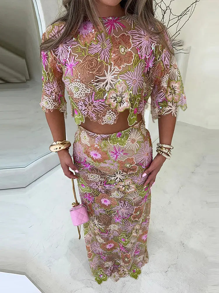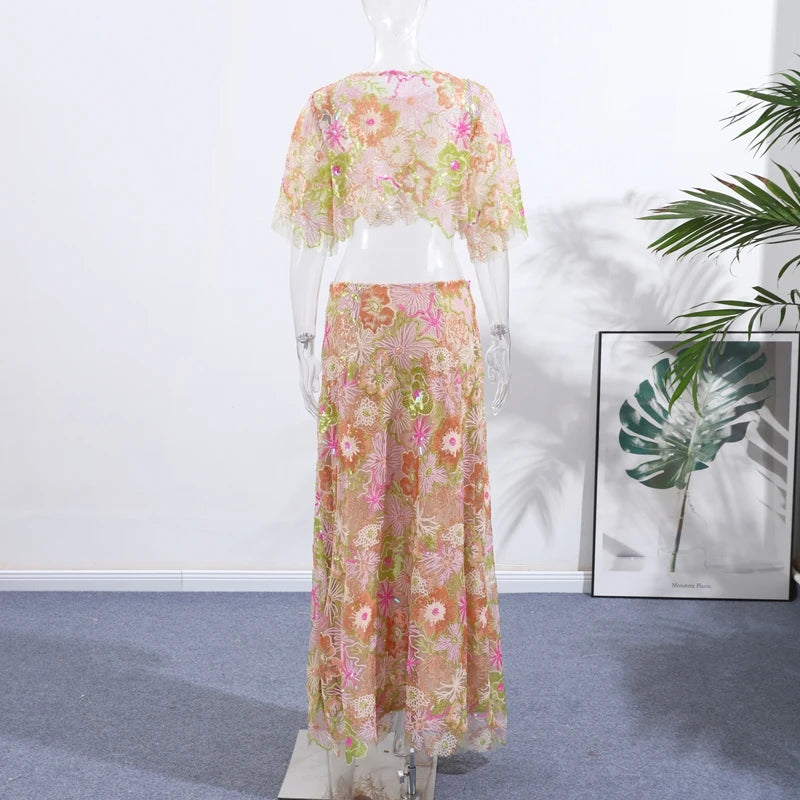 Sparkly Sequin Maxi Skirt Set – Lace Sheer Crop Top & Glitter Floral Pattern Long Skirt