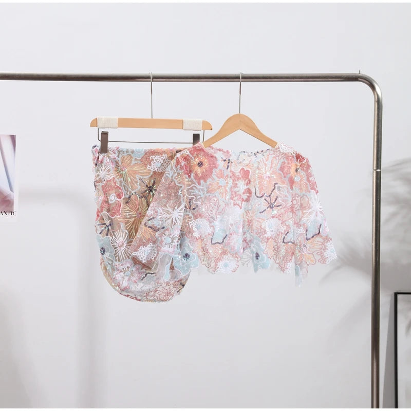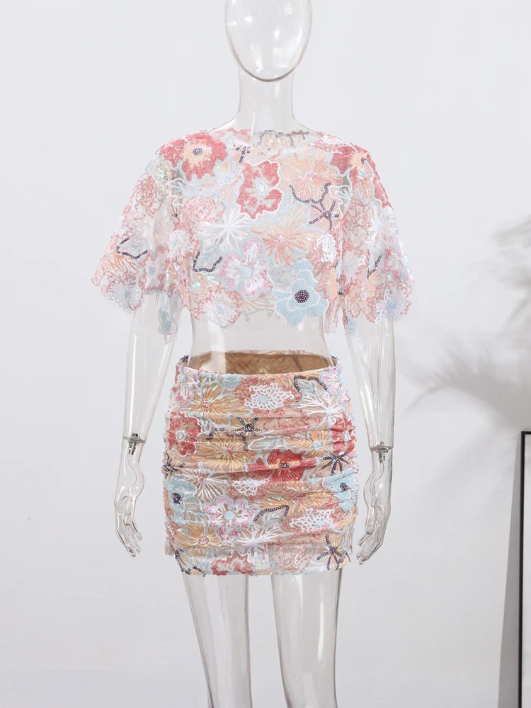 🌸 Lace Sheer Crop Top: Elegant and delicate with a flattering fit that complements the skirt.